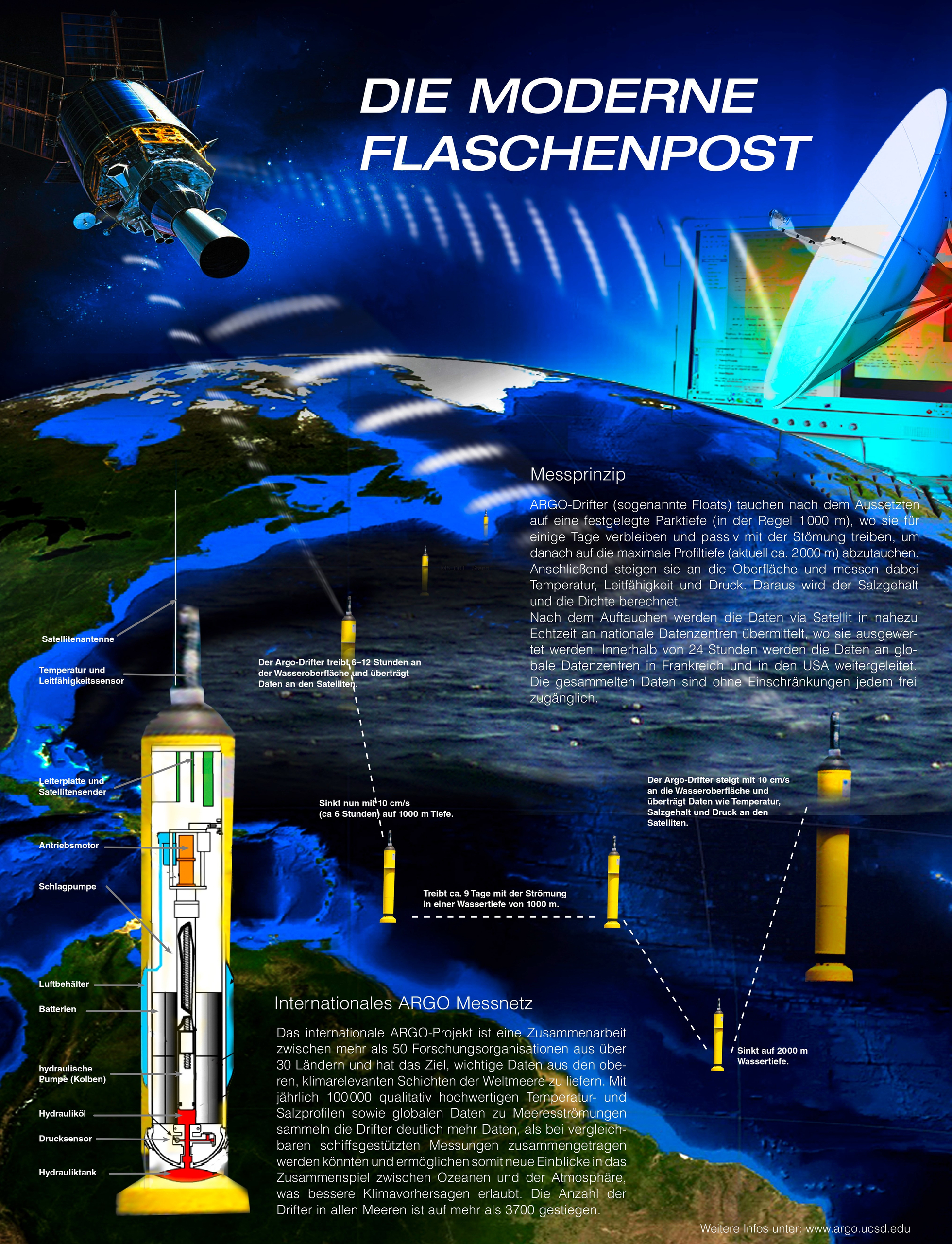 Auch wenn die Wissenschaft heute keine Glasflaschen mehr verwendet, ist das das Prinzip der Erforschung von Strömungen bis heute gleichgeblieben. Mittlerweile wird ein globales Netzwerk von Bojen eingesetzt, die wie autonome Mini-U-Boote vertikal abtauchen und auftauchen können. Argo Floats werden sie genannt, rund 4000 sind derzeit weltweit im Einsatz. Mehr als 30 Staaten beteiligen sich am Argo-Programm.