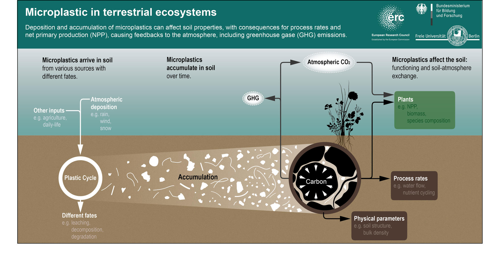 Ökologinnen und Ökologen der Freien Universität Berlin untersuchen und bewerten die Auswirkungen von Mikroplastik in Böden auf terrestrische Ökosysteme. Prof. Dr. Matthias Rillig und Dr. Anika Lehmann geben in einer Publikation der Fachzeitschrift Sciene einen Ausblick zu den Forschungsanstrengungen zu diesem Faktor des globalen Wandels. „Die wissenschaftliche Arbeit zu Mikroplastik (< 5 mm) im Boden hat ungefähr zehn Jahre später begonnen als die Beschäftigung mit diesen Plastik-Partikeln im Meer, wo sie eine offensichtlichere Erscheinung sind – und wo auch Nachweismethoden verhältnismäßig einfacher anzuwenden sind", erklärt Prof. Dr. Matthias Rillig. In ihrer Studie argumentieren er und Koautorin Annika Lehmann, dass man verstärkt Auswirkungen auf das Erdsystem im Blick haben müsse. Viele der Effekte von Mikroplastik im Boden könnten Prozesse verändern, die sich auf das Erdsystem auswirken können: Veränderungen von Treibhausgasemissionen aus dem Boden und Veränderung der Primärproduktion von Pflanzen sind die vielleicht wichtigsten Komponenten. Um diese Konsequenzen zu erfassen, seien grundsätzlich andere Experimente notwendig: Ansätze im Feld mit komplexen Lebensgemeinschaften und eine breit aufgestellte internationale Kooperation.