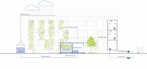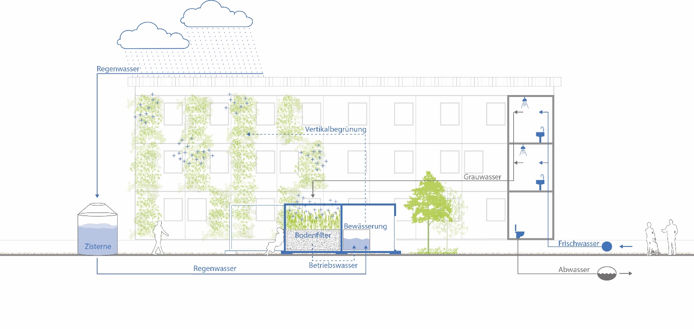 Das Projekt kombiniert dabei etablierte Technologien zur Speicherung und Behandlung von Wasser und neue Wandbegrünungssysteme auf kreative Weise. So ist mit der Vertikalbegrünung im Gerüst eine neue Form der Gebäudebegrünung entstanden. Eine weitere Innovation ist die Pflanzenkläranlage im Container, die nach Projektende auch an einen anderen Ort versetzt werden kann.