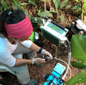 Die Verwendung dieser Art von Geräten in tropischen Regenwäldern ist ein bisschen knifflig. Der Gasanalysator wurde zwar tragbar konzipiert und ist für den Einsatz im Gelände gedacht, aber ich stelle immer wieder fest, dass diese Art von Geräten in gemäßigten Klimazonen entwickelt wurde. Sie sind nicht "amazonasfest". Das bedeutet, dass sie oft kaputt gehen oder aufgrund der hohen Luftfeuchtigkeit und Temperatur hin und wieder einfach nicht funktionieren. Wenn das passiert, sind wir bisweilen schon etwas enttäuscht oder verärgert.