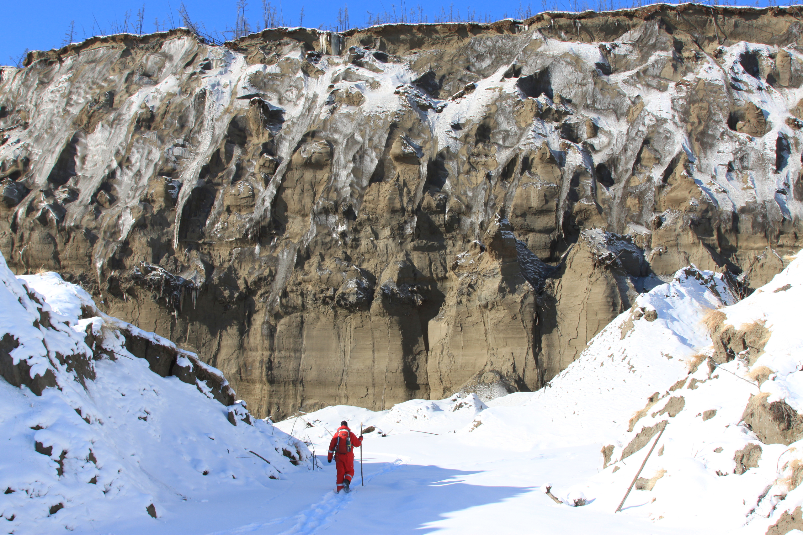 Insofern sind die aktuellen Ergebnisse, die das Forschungsteam jetzt im Magazin Quaternary Research veröffentlicht haben, von großer Relevanz. Die Situation bei Batagai zeigt aber auch, wie empfindlich der Permafrostboden auf Störungen durch den Menschen reagiert. Der 650.000 Jahre alte Permafrostboden liegt an einem Berghang eigentlich in rund 50 Meter Tiefe, wo permanent eine Temperatur von etwa minus 10 Grad Celsius herrscht. Ein Teil des Hangs aber war zwischen den 1940er und 1960er Jahren teilweise entwaldet und außerdem mit schweren Kettenfahrzeugen einer nahe gelegen Mine befahren worden. Dadurch ging die schützende und isolierende Pflanzendecke verloren. In der Folge taute der jüngere Permafrost an der Oberfläche im Sommer auf, bis der Boden schließlich ins Rutschen geriet und den alten Permafrost freilegte. Seit Jahren trägt das Schmelzwasser das aufgetaute Material hangabwärts, sodass ein großer Krater entstanden ist.