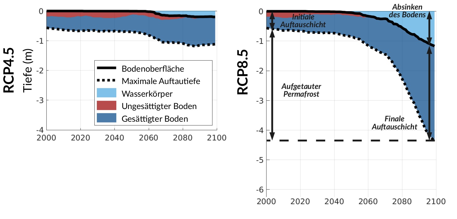 Die Forscher:innen konnten zeigen, dass insbesondere Permafrostböden mit einem hohen Eisanteil anfällig für schnelles Auftauen sind und durch abschmelzendes Bodeneis an Stabilität verlieren können. Daher ist in eisreichen Regionen das Risiko für Ökosysteme und bestehende Infrastrukturen besonders hoch. Diese sogenannten Thermokarst-Prozesse sind allerdings noch nicht in den globalen Klimamodellen berücksichtigt, sodass bisherige Modellrechnungen das Auftauen des Permafrosts unterschätzen. Infrastrukturen, wie Bauwerke und Straßen, könnten nach den Erkenntnissen des Projektes sogar Jahrzehnte früher von der Destabilisierung des Permafrostbodens betroffen sein als die natürliche Landschaft.
