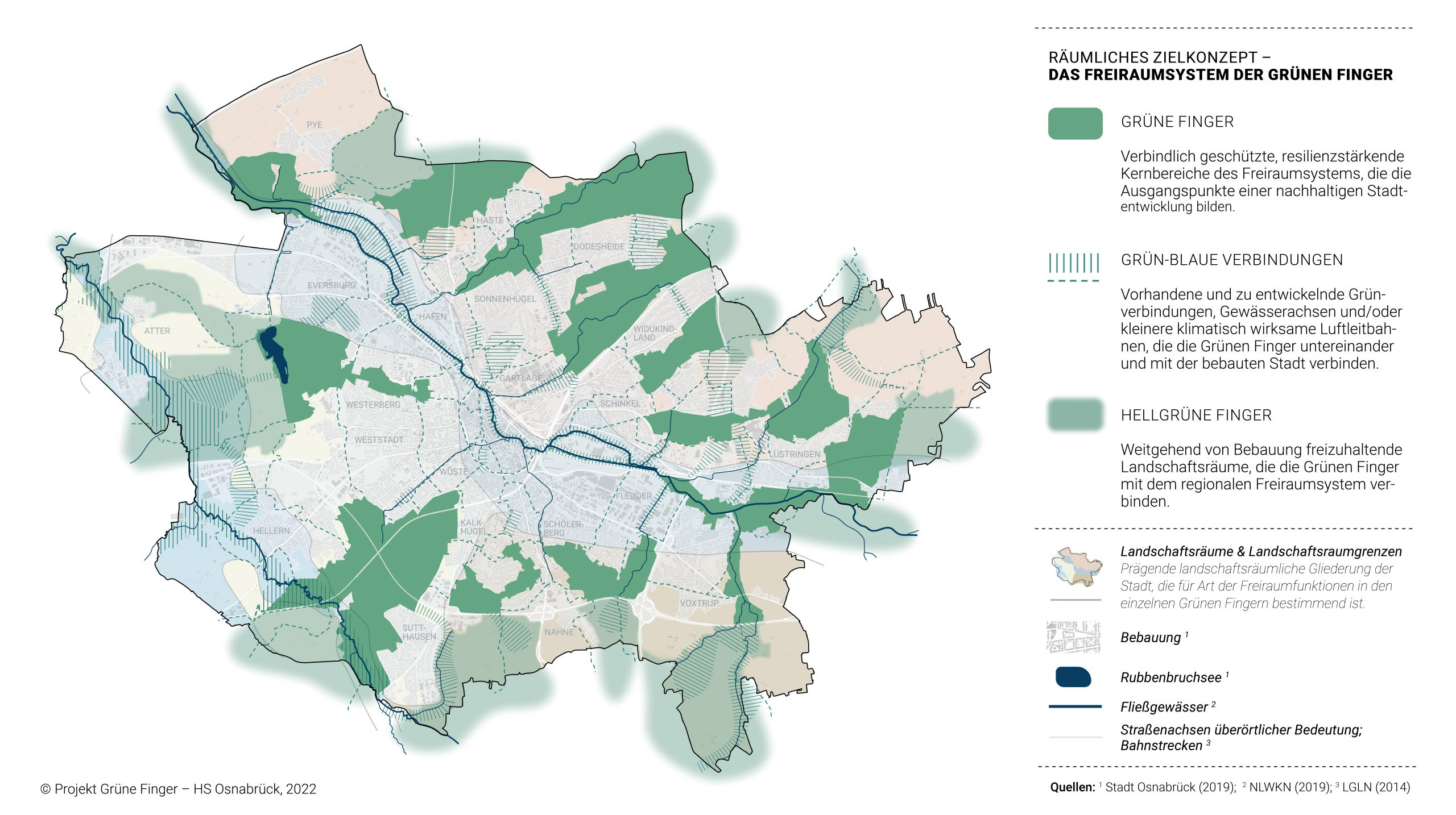 Dabei wurden durch eine landschaftsplanerische Raumanalyse und in der Zusammenarbeit mit den unterschiedlichen Akteursgruppen sowie Bürgerinnen und Bürgern vielfältige Erkenntnisse zu den Grünen Fingern und deren landschaftlichen Funktionen, Qualitäten, Herausforderungen und zu deren Wahrnehmung generiert. In gemeinsamen Raumerkundungen (Spaziergänge), Wahrnehmungswerkstätten mit Kunstschaffenden und Workshops zur zukünftigen Entwicklung Osnabrücks und der Grünen Finger wurden Stellschrauben für eine nachhaltige Stadtentwicklung aufgezeigt. Zudem wurden Leitsätze zur Entwicklung der Grünen Finger formuliert sowie ein neues Verständnis und Bewusstsein für den Wert der Grünen Finger geschaffen. Ein Maßnahmenkonzept für die aktive Entwicklung der Grünen Finger zeigt auf, wie Osnabrück zur Stadt der Grünen Finger werden kann.