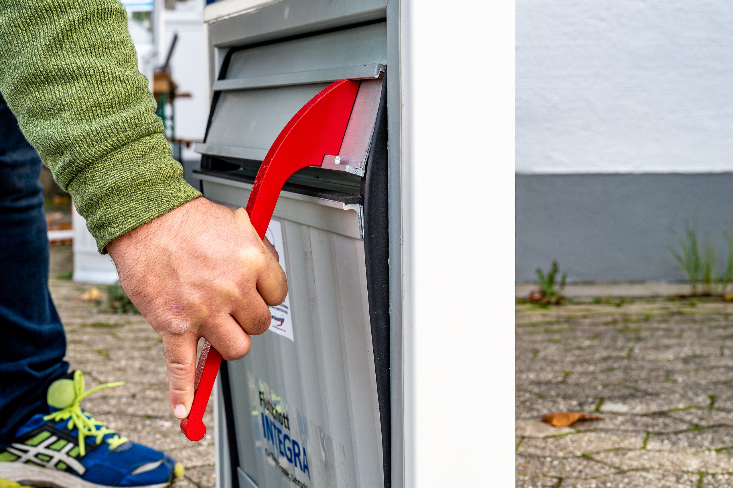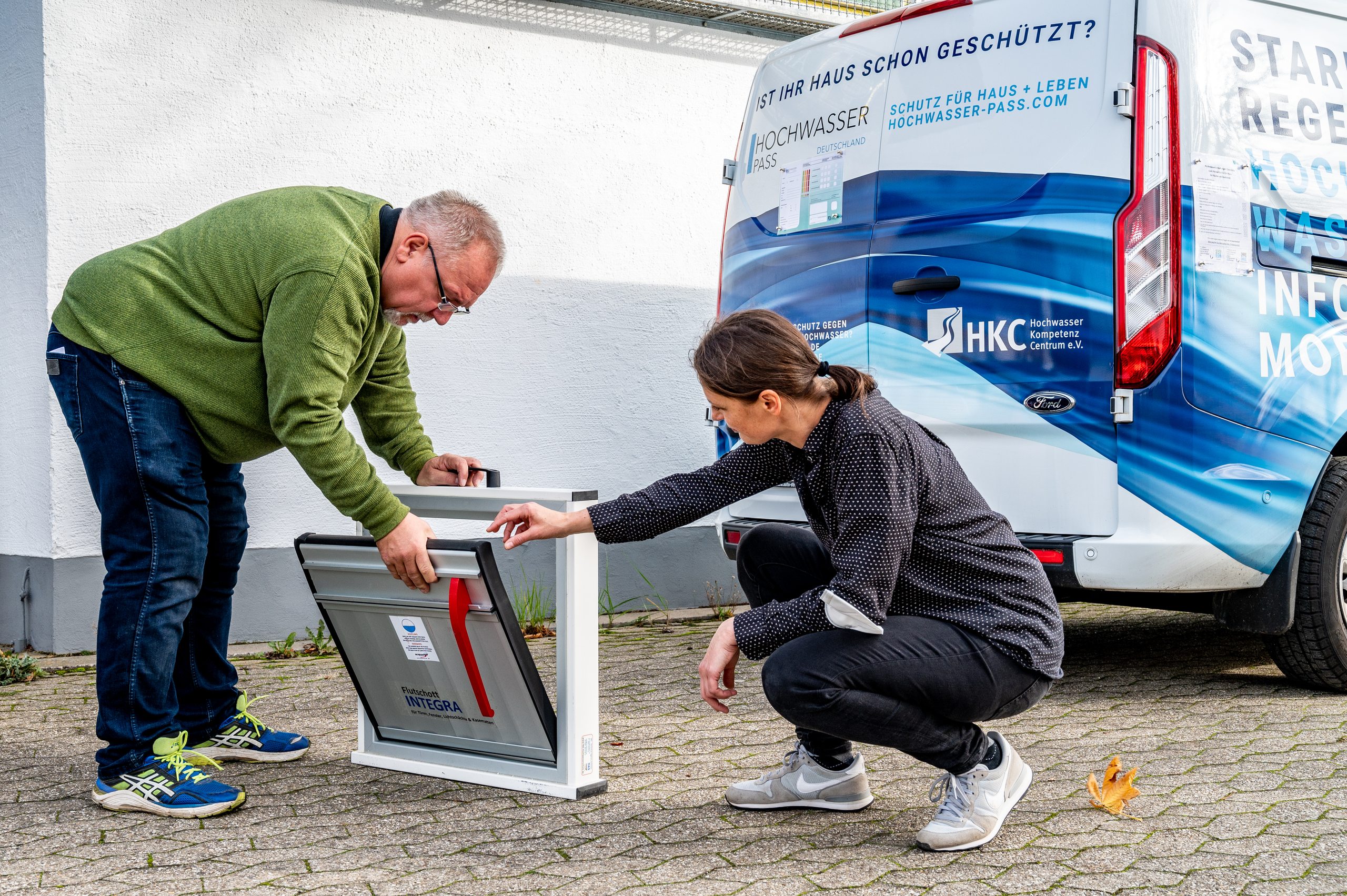 Mit einem roten Hebel in der Hand zeigt Hans-Theodor Arenz, wie sich Flutschotts schließen und wieder öffnen lassen. „Solche Flutschotts eignen sich zum Beispiel zur Abriegelung von Kellerfenstern, aber auch von Haustüren", erklärt der gelernte Architekt. „Es ist uns wichtig zu zeigen, welche unterschiedlichen Varianten es hierbei gibt. Viele Leute sind neugierig, die Schotts selbst auszuprobieren und so besser einschätzen zu können, ob sie sich zum Schutz des eigenen Hauses eignen. Bei allen Beratungen, die wir im KAHR-Projekt durchführen, merken wir deutlich: Fast alle waren von der Flutkatastrophe direkt betroffen oder haben das Ausmaß der Zerstörungen mit eigenen Augen gesehen und erlebt. Das Thema Starkregen ist nicht nur Theorie, sondern jeder kommt mit seiner eigenen persönlichen Geschichte hierhin und weiß genau, was Hochwasserschäden materiell und immateriell bedeuten."