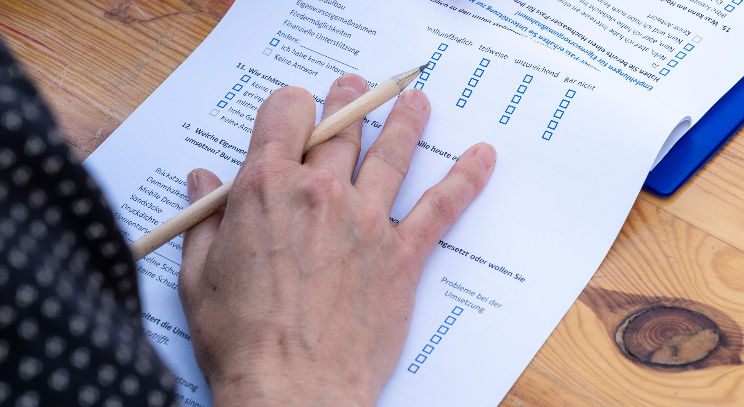 Etwa viermal im Monat fährt das Beratungsteam in die Flutregionen in Rheinland-Pfalz und Nordrhein-Westfalen. Die Bilanz für 2022: Insgesamt 711 Gespräche an 40 Einsatzorten führte das Team durch. „Neben den direkten Beratungen haben wir ein weiteres, sehr wichtiges Anliegen: Wir möchten von den Menschen auch erfahren, wer in welchem Ausmaß von der Flut 2021 betroffen war, ob und wie stark ihnen vor Eintreten des Hochwassers die Gefahr für die eigene Immobilie bewusst war oder welche Schutzmaßnahmen für Immobilien bekannt waren oder vielleicht sogar schon angewendet wurden", erläutert Lina Fitz. „Um diese Informationen systematisch zu sammeln, haben wir gemeinsam mit der Hochschule Koblenz – ebenfalls ein Partner im KAHR-Projekt – einen Fragebogen entwickelt, der anonym von den Menschen nach der Beratung ausgefüllt werden kann. Mittlerweile haben wir über 500 beantwortete Bögen vorliegen, die Umfrage läuft noch bis Mai 2023."