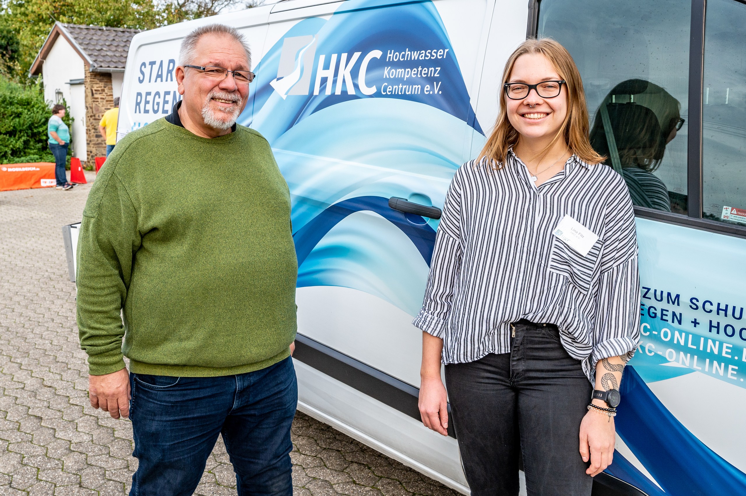 „Das Hochwasser hat uns komplett unerwartet und unvorbereitet getroffen. In den Nachrichten am Vortag war von großen Regenmengen die Rede, das klang zwar viel, aber längst nicht bedrohlich. Keiner von uns hatte mit einem solchen Pegelanstieg des kleinen Eulenbachs gerechnet," so berichten mehrere anwesende Betroffene von der Flutkatastrophe, die sie im Juli 2021 im nordrhein-westfälischen Rheinbach-Ramershoven überraschte. Heute, fast eineinhalb Jahre nach der Katastrophe, stehen sie beim KAHR-Infomobil und hören der Beratung von Hans-Theodor Arenz und Lina Fitz zu den Themen privater Hochwasserschutz und Eigenvorsorge zu. Beide arbeiten beim HochwasserKompetenzCentrum (HKC) und stellen den interessierten Bewohnerinnen und Bewohnern des 500-Seelen-Ortes, deren Grundstücke, Privat- und Gewerbeimmobilien bei dem Extremereignis im vergangenen Jahr beschädigt wurden, verschiedene Hochwasserschutz-Maßnahmen vor.