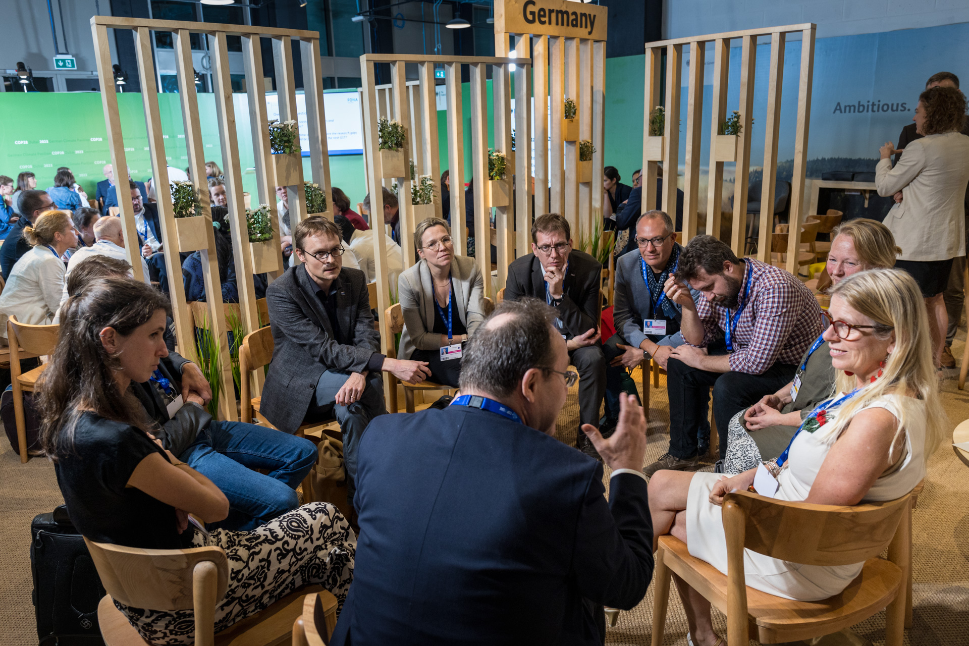 Der BMBF-„Science for Action–Evening" im deutschen Pavillon bot am 8. Dezember 2023 eine Bühne für IPCC-Expertinnen und -Experten im direkten Austausch mit Delegierten. Die Grundlage für die Diskussion boten zwei Eingangsstatements: