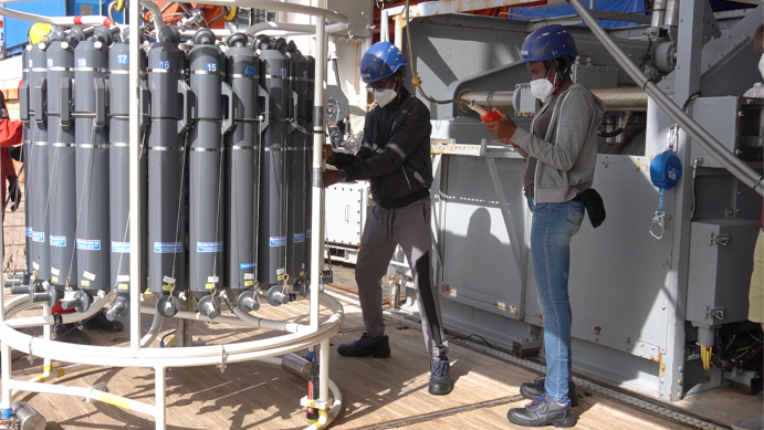Osvaldina Julião Fernandes Soares sagt dazu: „Ich habe viel gelernt, was ich an Land nicht hätte lernen können. Auch, was es bedeutet, auf Station zu sein und Proben auf einem fahrenden Schiff zu nehmen", fügt sie hinzu. Amie Ndure, eine Studentin aus Gambia, stimmt dem zu: „Im Masterstudiengang haben wir theoretisches Wissen erworben, aber die Anwendung bei Messungen und Beobachtungen auf See ist eine unschätzbare Erfahrung". Die persönliche Erfahrung kann sehr intensiv sein: „Es ist wirklich emotional, in dieser geschlossenen Umgebung mit so vielen Kolleginnen und Kollegen zu sein und täglich mit allen zu interagieren. Ich kann es gar nicht in Worte fassen", ergänzt sie. Amadou Biteye, ein Student aus dem Senegal, hat den Morgen des vierten Tages damit verbracht, Wasserproben des CTD-Messgerätes in Flaschen zu füllen, um den Sauerstoffgehalt in den verschiedenen Wassertiefen zu messen. Dazu sagt er: „Wenn ich den ganzen Prozess der Entnahme und Analyse einer einzigen Probe durchlaufe, verstehe ich jetzt wirklich, woher die Daten kommen, und weiß zu schätzen, was in den globalen Datensätzen für jede Messung steckt. Es ist wirklich erstaunlich. Das ist Ozeanographie - Jahre der Planung, Wochen der Schiffszeit und Tage der Seekrankheit gipfeln in stundenlangen, sorgfältigen Messungen für einige wenige, wertvolle Datenpunkte. So etwas lernt man nicht im Labor!"
