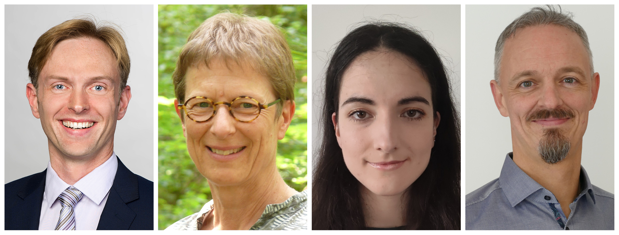 Von links nach rechts: Prof. Dr. J. Philipp Benz (Leiter der Professur für Pilz-Biotechnologie in der Holzwissenschaft, Technische Universität München) Copyright: TUM, Prof. Dr. Karin Pritsch (Wissenschaftlerin, Abteilung Experimentelle Umweltsimulation, Helmholtz Munich und Professur für Land-Surface Atmosphere Interactions, Technische Universität München, zweite von links) Copyright: privat, M.Sc. Sonja Magosch (Doktorandin, Professur für Pilz-Biotechnologie in der Holzwissenschaft, Technische Universität München) Copyright: privat, Dr. Michael Rothballer (Arbeitsgruppenleiter Molekulare Mikrobenökologie, Institut für Netzwerkbiologie, Helmholtz Munich) Copyright: privat.