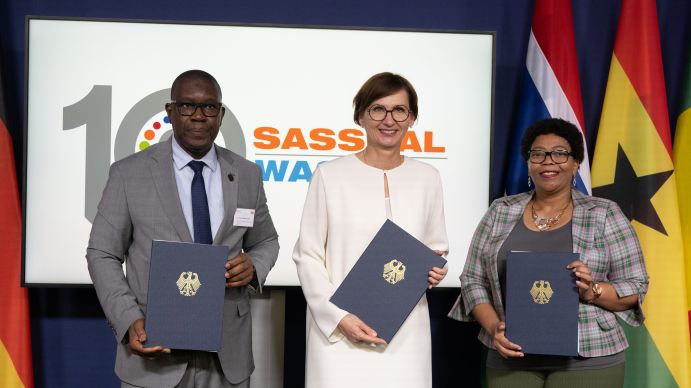 Vor über zehn Jahren initiierte das Bundesministerium für Bildung und Forschung (BMBF) die Gründung der Klimakompetenzzentren WASCAL und SASSCAL zusammen mit Partnerländern im westlichen und südlichen Afrika. Am Anfang stand der Aufbau der Zentren im Fokus. Mittlerweile sind WASCAL und SASSCAL etablierte Organisationen. Das Ziel: gemeinsam Hochschulausbildung und Anpassungskapazitäten stärken und Strukturen schaffen, um deutsch-afrikanische Forschung zu Klimaschutz und Klimaanpassung in Afrika zu bündeln und auszubauen. Im Rahmen der Ministerkonferenz in Berlin unterzeichnete Ministerin Bettina Stark-Watzinger zusammen mit Ministerin Philda Kereng, stellvertretende Vorsitzende des Ministerrats von SASSCAL, und Minister Prof. Amadou Keita, Vorsitzender des Ministerrats von WASCAL, eine gemeinsame Absichtserklärung: Auch in Zukunft soll die Klima- und Energiepartnerschaft zwischen WASCAL, SASSCAL und dem BMBF weiter gestärkt werden und durch deutsch-afrikanische Forschung innovative Lösungen finden – wie zum Beispiel für klimaangepasste Landnutzung oder beim Thema „Grüner Wasserstoff".