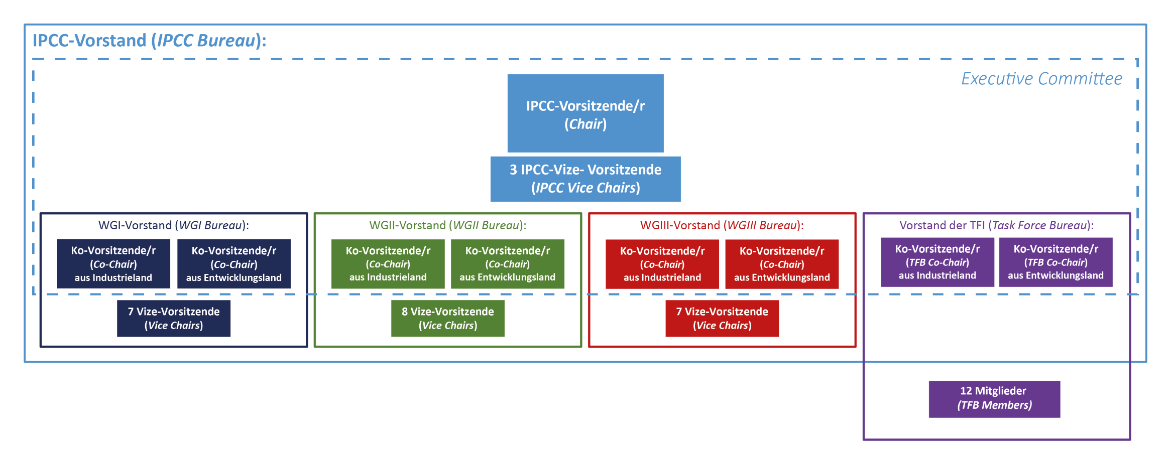 Außerdem werden 12 weitere Mitglieder des TFI-Vorstands (Task Force Bureau, TFB) gewählt, die aber nicht dem Gesamtvorstand des IPCC angehören (siehe auch Abbildung unten).
