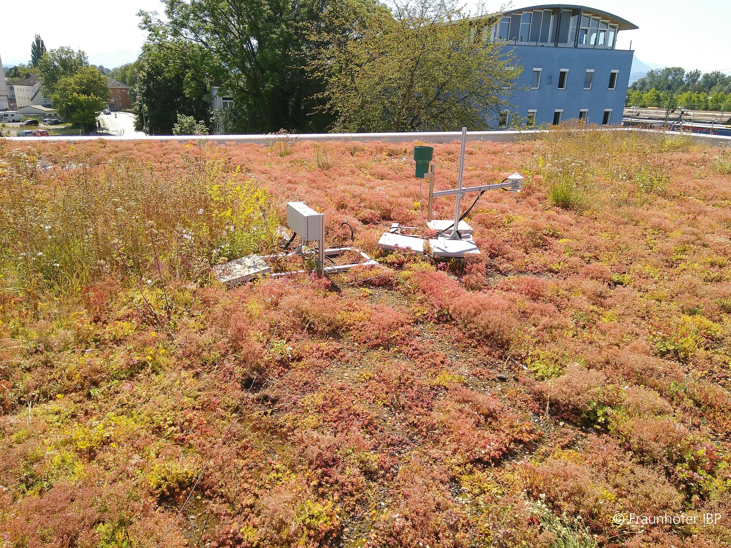Die Forschenden haben im Rahmen des Projekts BUOLUS analysiert, dass es insbesondere auf die Art des Gründachaufbaus ankommt, damit eine Dachbegrünung die erforderlichen Eigenschaften hat. Für die Forschungsarbeiten erstellte das Projektteam auf dem Dach eines Fahrradparkhauses in Rosenheim eine ca. 400 Quadratmeter große Pilotanlage und führte etwa zwei Jahre lang Messungen durch, um zu beobachten, wie sich die Vegetation und der Wasserabfluss bei Regen verhält.