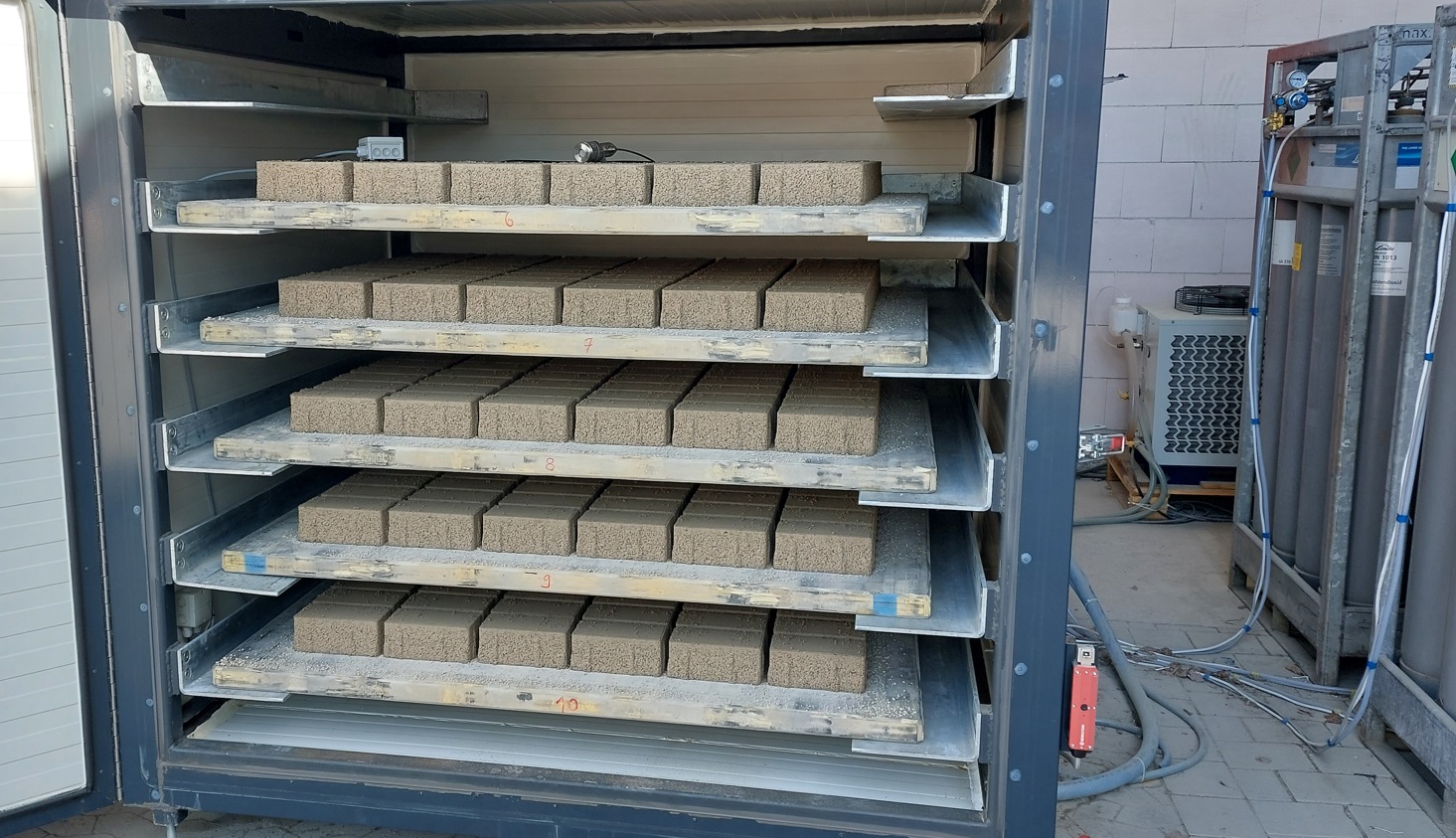 Im zweiten Schritt wurde ein neues Verfahren zur weiteren Verarbeitung des Zements zu Beton erprobt. Ziel dieses Teilprojektes war es, das CO2, das während der Zementherstellung ausgestoßen wird, dauerhaft in Betonprodukten durch Karbonatisierungshärtung zu speichern. In der Testphase hat sich das Projekt K4 auf die Speicherung von CO2 in Pflastersteinen konzentriert. In den aus Beton gefertigten Steinen wurde das CO2 in sogenannten Karbonatisierungskammern hinzugefügt. „Wir haben unterschiedliche Tests in den Kammern durchgeführt mit variierenden CO2-Konzentrationen, Temperaturen und Luftfeuchtigkeiten. Letzten Endes haben wir ein neues Verfahren entwickelt mit dem wir sicherstellen können, dass das in die Steine eingebrachte CO2 dauerhaft eingebunden ist und die gewünschte Qualität der Pflastersteine erreicht wird. Die Forschungs- und Entwicklungsphase ist damit erfolgreich abgeschlossen. Jetzt könnten diese Verfahren von der Industrie umgesetzt werden.“