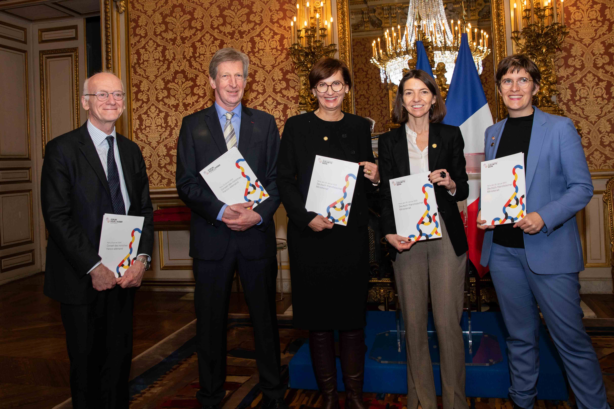 Die beiden Ko-Direktoren des Deutsch-französischen Zukunftswerks (DFZW), Gilles de Margerie und Prof. Dr. Frank Baasner überreichten am 22. Januar 2023, dem 4. Jahrestag des Vertrags von Aachen, die aus den lokalen Erfahrungen deutscher und französischer Kommunen abgeleiteten Handlungsempfehlungen des ersten Arbeitszyklus. Als Regierungsvertreterinnen nahmen die deutsche Bundesministerin für Bildung und Forschung, Bettina Stark-Watzinger, sowie die beiden Beauftragten für die deutsch-französische Zusammenarbeit, Laurence Boone, Staatssekretärin bei der Ministerin für Europa und auswärtige Angelegenheiten, und Anna Lührmann, Staatsministerin für Europa und Klima im Auswärtigen Amt, die Empfehlungen entgegen.