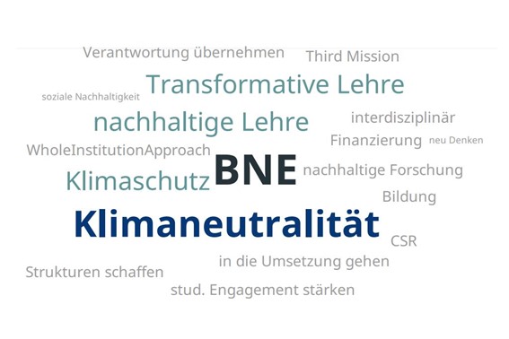 Aus den Antworten ergab sich das nebenstehende Bild als Wortwolke. Bei der Live-Umfrage hatten 118 Personen ihre Einschätzung zur wichtigsten Herausforderung für mehr Nachhaltigkeit an Hochschulen geteilt.