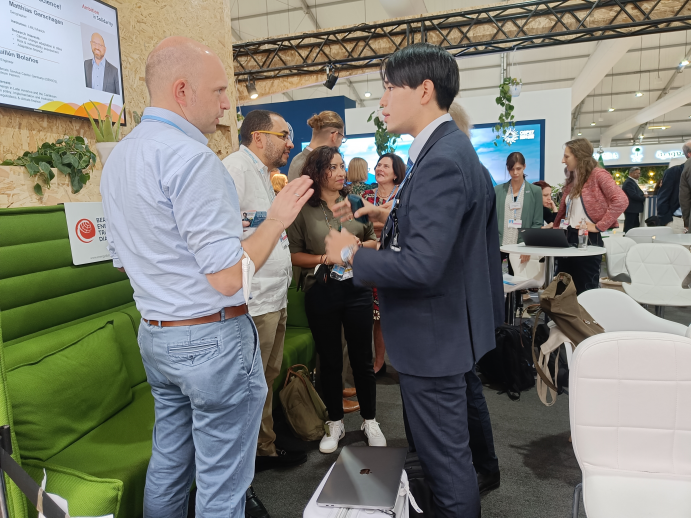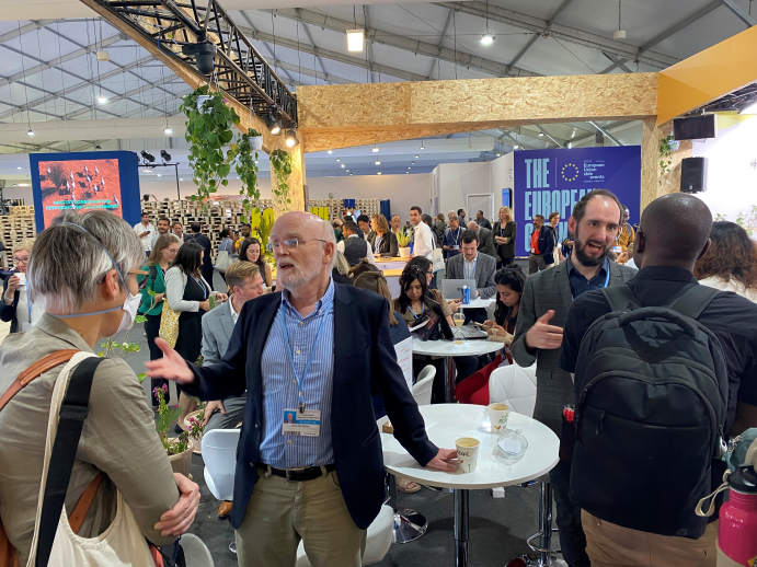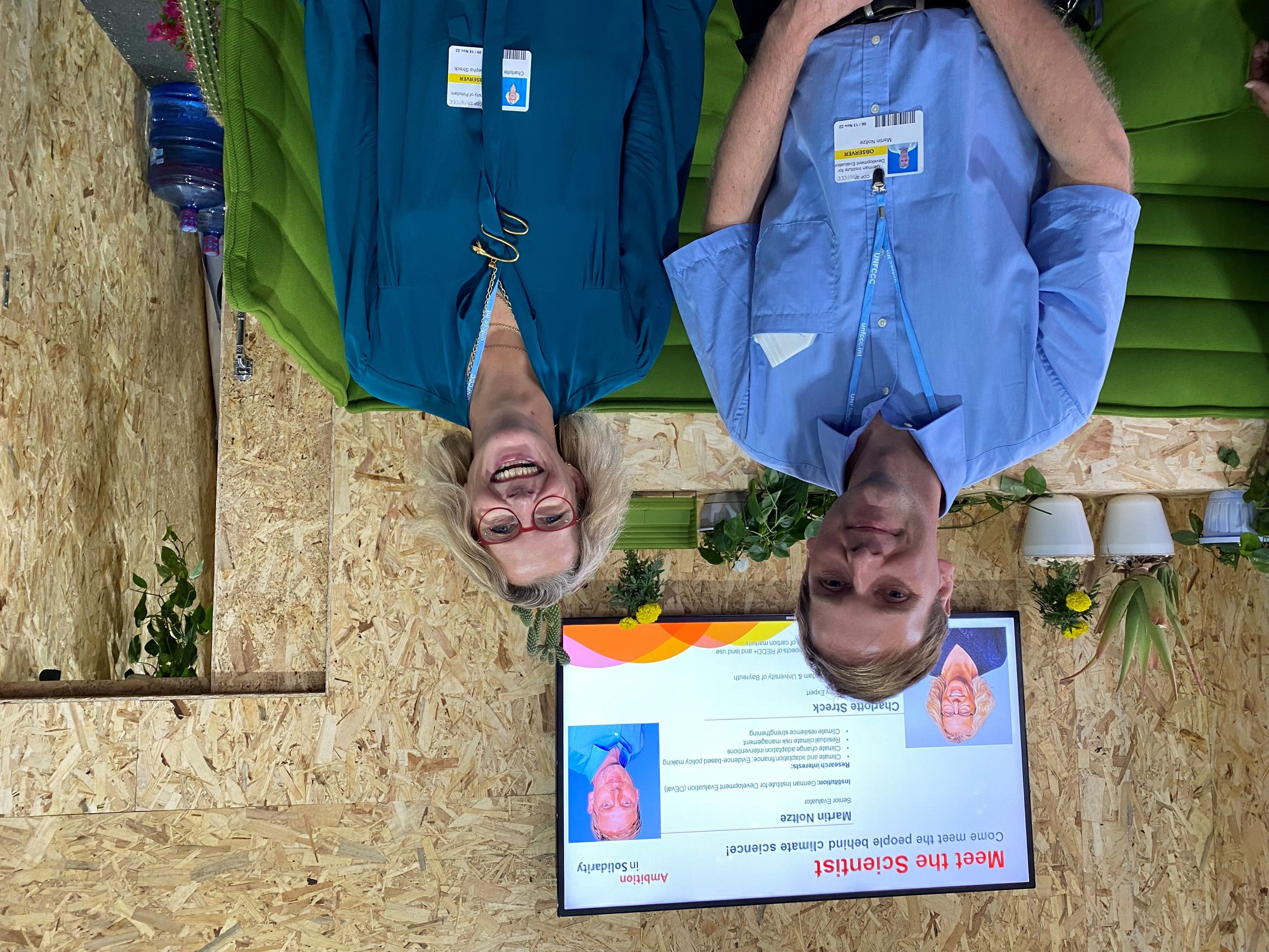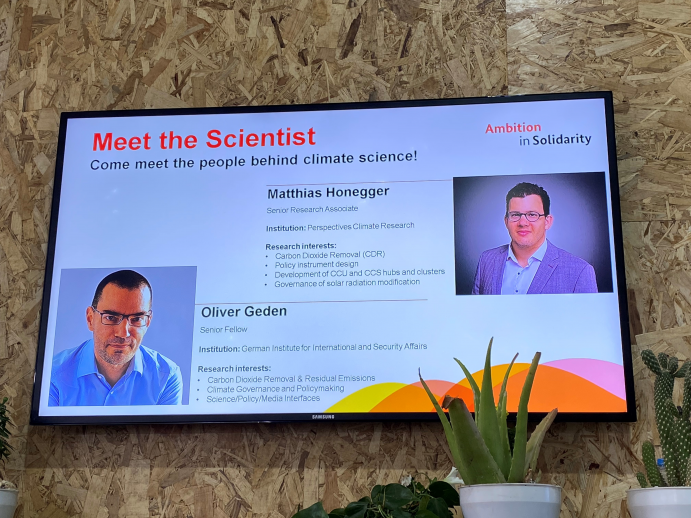 Am Deutschen Pavillon diskutieren in der Mittagszeit Wissenschaftlerinnen und Wissenschaftler mit interessierten Besucherinnen und Besuchern über die wissenschaftlichen Hintergründe von Klimapolitik. In diesem ungezwungenen und informellen Austauschformat sollen Gespräche zustande kommen, die sowohl das Verständnis für wissenschaftliche Erkenntnisse erhöhen als auch die Personen dahinter greifbar machen.