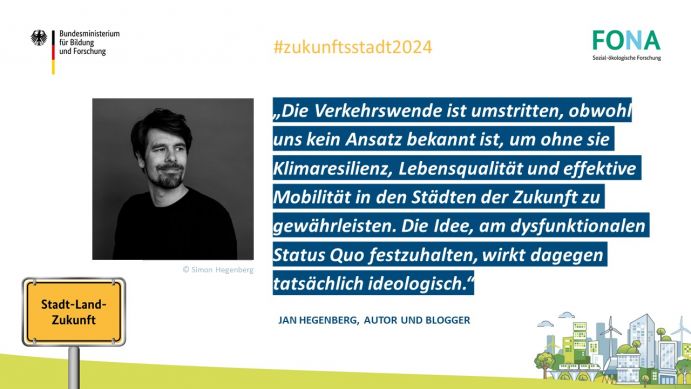 Er berichtete anschaulich über das Ringen um Akzeptanz für die Transformation zur Nachhaltigkeit und über Diskussionen, die er alltäglich auch in den sozialen Medien zum Thema führt. „Die Verkehrswende ist umstritten, obwohl uns kein Ansatz bekannt ist, um ohne sie Klimaresilienz, Lebensqualität und effektive Mobilität in den Städten der Zukunft zu gewährleisten. Die Idee, am dysfunktionalen Status Quo festzuhalten, wirkt dagegen tatsächlich ideologisch", so Hegenberg.