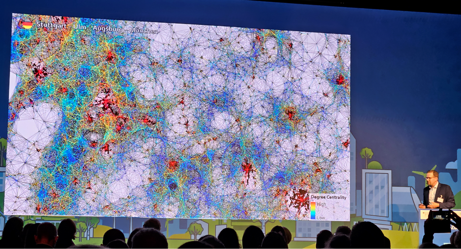 Dr. Stefan Carsten inspirierte das Publikum in seiner Keynote mit der Frage, wie unsere Städte und Regionen in etwa zehn Jahren aussehen? Als Zukunftsforscher für Stadt- und Mobilitätsthemen skizzierte er die Entwicklung hin zu multifunktionalen Räumen der wissensbasierten Stadt. Demnach werden Lebens- und Aufenthaltsqualität in der nachhaltigen und resilienten Stadtentwicklung eine zunehmend wichtige Rolle spielen. Das wirtschaftliche Leben in Form von Dienstleistungen oder Gewerbestandorten und Wohnraum, wird in klimaangepassten Städten durch kurze Wege gekennzeichnet sein. Zentral sind dabei digitalisierte Hubs, in denen unterschiedliche Mobilitätslösungen wie zum Beispiel Bike- oder Carsharing, aber auch ein autonomer, bedarfsgerechter ÖPNV mit 24-stündiger Verfügbarkeit angeboten werden.