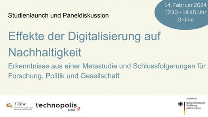 Die Metastudie „Nachhaltigkeitseffekte der Digitalisierung" wurde vom BMBF beauftragt und von der Technopolis Group und dem IÖW durchgeführt. Sie bereitet die internationale wissenschaftliche Studienlage zu den Umwelteffekten der Digitalisierung für verschiedene Themenfelder wie Klima, Energie, Kreislaufwirtschaft und Mobilität auf. Mit einem Fokus auf Studien mit quantifizierten Effekten identifiziert die Metastudie Forschungslücken/-bedarfe und gibt Handlungsempfehlungen für Forschung und Forschungsförderung.