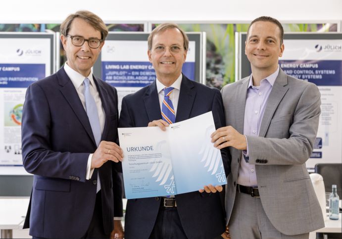 Mit dem "Living Lab Energy Campus" (LLEC) verwandelte sich das Forschungszentrum Jülich vor einem Jahr in ein "Reallabor für die Energiewende", in dem neueste wissenschaftliche Erkenntnisse auf ihre Wirksamkeit und Alltagstauglichkeit erprobt werden. Im Teilprojekt "LLEC: P2G++" soll nun bis 2022 untersucht werden, wie große Mengen erneuerbare Energien in Form von chemisch gebundenem Wasserstoff mit einem neuen Verfahren ganzjährig gespeichert werden können. Wasserstoff ist ein universell einsetzbarer Energieträger, der sich zum Beispiel mithilfe von Brennstoffzellen als "Treibstoff" für die Elektromobilität nutzen lässt. Forschungsstaatssekretär Thomas Rachel MdB überreichte heute eine Förderurkunde über rund sechs Millionen Euro – die Summe, mit der das Bundesministerium für Bildung und Forschung (BMBF) das Teilprojekt fördert.
