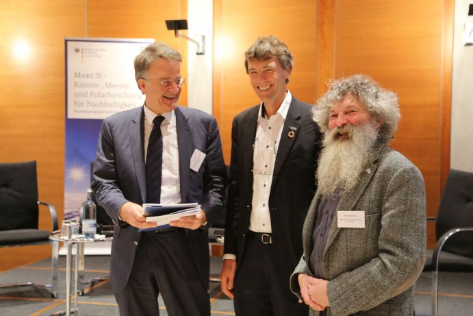 Prof. Dr. Ulrich Bathmann und Prof. Dr. Martin Visbeck präsentierten die Ergebnisse der Expertenkreise Blauer Ozean und Küste und überreichten Volker Rieke als Leiter der Abteilung „Zukunftsvorsorge – Forschung für Grundlagen und Nachhaltige Entwicklung" im BMBF die MARE:N-Konzeptpapiere „Küste im Wandel" und „Blauer Ozean". Diese dienen der inhaltlichen Ausgestaltung der im Forschungsprogramm MARE:N dargestellten Themenschwerpunkte der Küsten- und Meeresforschung dar.