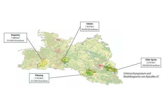 Untersuchungsraum und Modellregionen von NaLaMa-nT