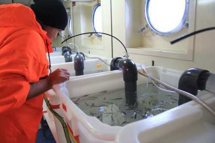 Die Heincke-Expedition nach Spitzbergen im Sommer 2013 fand im Rahmen des sogenannten Fisch-Konsortiums statt, einem Teilprojekt von BIOACID, welches die Auswirkungen der Ozeanversauerung in einem sich erwärmenden Klima auf Interaktionen zwischen den Arten erforscht. Mithilfe der Forschungsexpedition nach Spitzbergen soll die Frage beantwortet werden, ob und in welchem Ausmaß der "eingewanderte" Atlantische Kabeljau und der "heimische" Polardorsch in einem Konkurrenzkampf zueinander stehen und inwiefern die zunehmende Versauerung des Meeres eine mögliche Rivalität beeinflusst. Fotoinhalt: Nach dem Fang haben die Wissenschaftler die Atlantischen Kabeljaue in die vorläufigen Hälterungsbecken im Thermolabor der FS Heincke gebracht. Hier konnten sich die Fische zunächst erholen. Nach einigen Stunden oder am folgenden Tag setzten die Wissenschaftler die Fische dann in Aquarien um. Weitere Informationen zur Expedition finden Sie hier. Das Projekt BIOACID wird innerhalb der Meeresforschung im BMBF-Rahmenprogramm "Forschung für Nachhaltige Entwicklungen" (FONA) gefördert. Die zweite Phase läuft seit September 2012 für drei Jahre und wird vom GEOMAR Helmholtz-Zentrum für Ozeanforschung Kiel koordiniert. Das Projekt erforscht die Ozeanversauerung, die sich laut aktuellem wissenschaftlichem Stand eine ernsthafte Bedrohung für Meeresorganismen und –ökosysteme entwickeln kann. Ziel ist es die Kette von biologischen Mechanismen, über Reaktionen von Organismen, zu deren Auswirkungen auf Nahrungsnetze und Ökosysteme, bis hin zu den ökonomischen Konsequenzen zu erfassen und besser zu verstehen. Mehr Informationen zum Projekt finden Sie hier und unter http://www.bioacid.de/