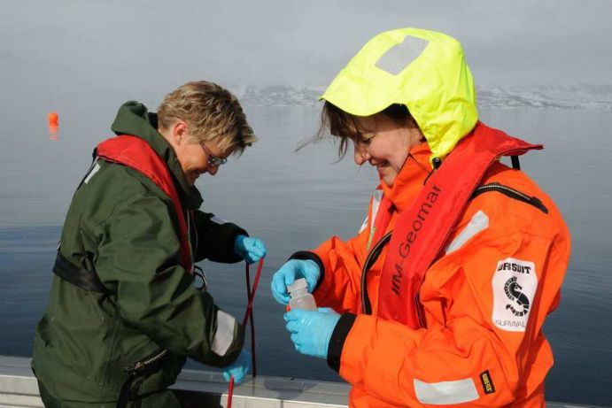 Täglich werden an den Mesokosmen Proben gesammelt und Messungen vorgenommen. Das Experiment fand im Rahmen des Konsortiums 1 "Pelalgische Ökosysteme" statt, einem Teilprojekt von BIOACID. Dieses untersucht ökologische, biogeochemische und evolutionäre Reaktionen von pelalgischen Ökosystemen unter Ozeanversauerung. Hintergrund des Langzeit-Experiments war die Frage, wie komplexe Lebensgemeinschaften auf Ozeanversauerung reagieren und ob sie sich über längere Zeiträume an die neuen Umweltbedingungen anpassen können. Weitere Informationen zum Experiment finden Sie hier. Das Projekt BIOACID II wird innerhalb der Meeresforschung über das BMBF-Rahmenprogramm Forschung für Nachhaltige Entwicklungen (FONA) gefördert. Die zweite Phase läuft seit September 2012 für drei Jahre und wird vom GEOMAR Helmholtz-Zentrum für Ozeanforschung Kiel koordiniert. Das Projekt erforscht die Ozeanversauerung, die sich laut aktuellem wissenschaftlichem Stand eine ernsthafte Bedrohung für Meeresorganismen und –ökosysteme entwickeln kann. Ziel ist es die Kette von biologischen Mechanismen, über Reaktionen von Organismen, zu deren Auswirkungen auf Nahrungsnetze und Ökosysteme, bis hin zu den ökonomischen Konsequenzen zu erfassen und besser zu verstehen. Mehr Informationen zum Projekt finden Sie hier und unter http://www.bioacid.de/