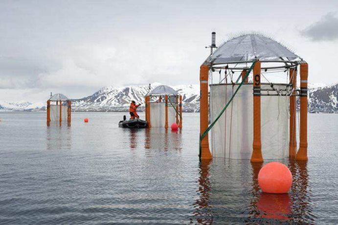 Um zukünftige Lebensbedingungen zu simulieren, setzen die Forscher den Mesokosmen mit Kohlendioxid angereichertes Wasser zu. Das Experiment fand im Rahmen des Konsortiums 1 "Pelalgische Ökosysteme" statt, einem Teilprojekt von BIOACID. Dieses untersucht ökologische, biogeochemische und evolutionäre Reaktionen von pelalgischen Ökosystemen unter Ozeanversauerung. Hintergrund des Langzeit-Experiments war die Frage, wie komplexe Lebensgemeinschaften auf Ozeanversauerung reagieren und ob sie sich über längere Zeiträume an die neuen Umweltbedingungen anpassen können. Weitere Informationen zum Experiment finden Sie hier. Das Projekt BIOACID II wird innerhalb der Meeresforschung über das BMBF-Rahmenprogramm Forschung für Nachhaltige Entwicklungen (FONA) gefördert. Die zweite Phase läuft seit September 2012 für drei Jahre und wird vom GEOMAR Helmholtz-Zentrum für Ozeanforschung Kiel koordiniert. Das Projekt erforscht die Ozeanversauerung, die sich laut aktuellem wissenschaftlichem Stand eine ernsthafte Bedrohung für Meeresorganismen und –ökosysteme entwickeln kann. Ziel ist es die Kette von biologischen Mechanismen, über Reaktionen von Organismen, zu deren Auswirkungen auf Nahrungsnetze und Ökosysteme, bis hin zu den ökonomischen Konsequenzen zu erfassen und besser zu verstehen. Mehr Informationen zum Projekt finden Sie hier und unter http://www.bioacid.de/