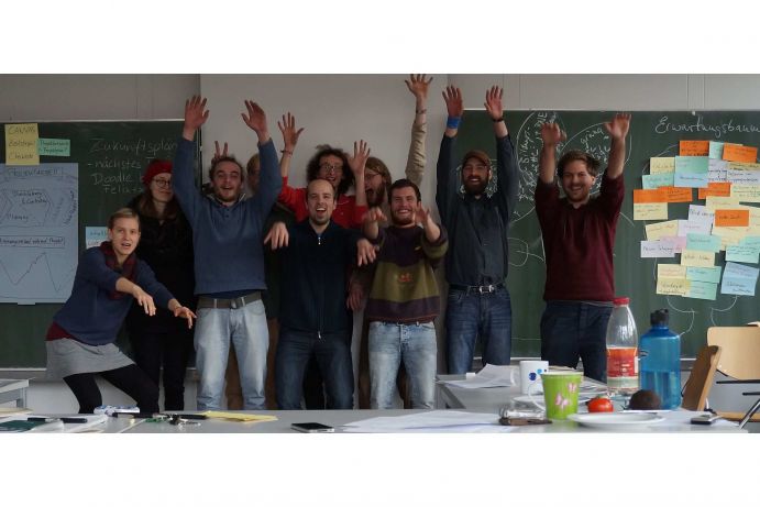 Carina Schilling und Sebastian Radke (netzwerk n) mit Mitgliedern der Degrowth-Initiative an der Universität Osnabrück. Über ein Wochenende hinweg arbeiteten sie intensiv zum Thema „Hochschule in nachhaltiger Entwicklung“. Dabei diskutierten sie Best-Practices, arbeiteten an ihren Gruppen-internen Arbeitsstrukturen und entwickelten neue Projekte. Universität Osnabrück, Februar 2015.
