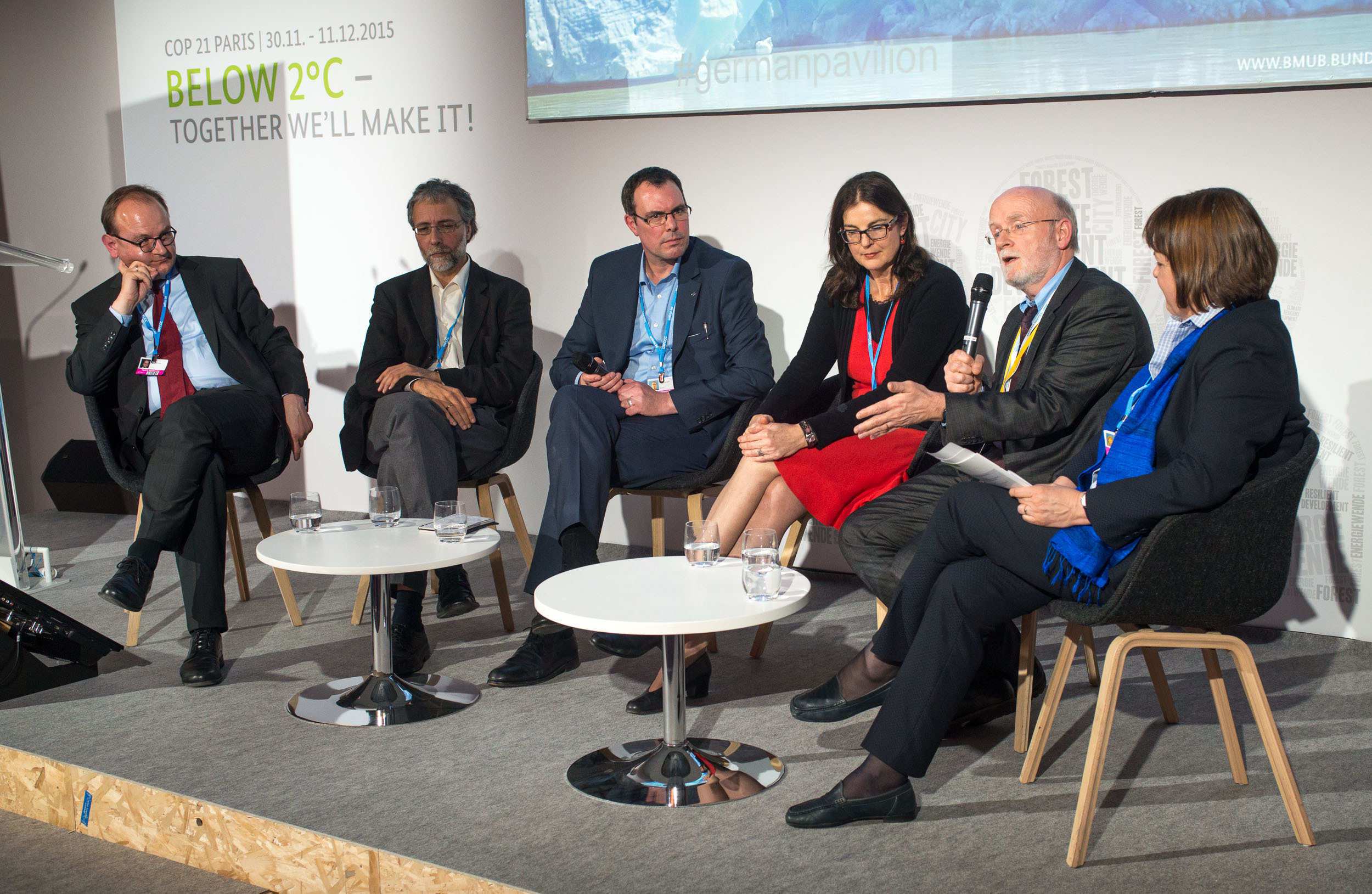 V.l.n.r.: Podiumsdiskussion mit Ottmar Edenhofer, PIK, Christoph Bals, Germanwatch, Gregor Laumann, DLR-PT, Grit Martinez, Ecologic Institut und Vera Stercken, Bundesforschungsministerium. Auf dem BMBF-Side Event „From Research to Decision Making”, welches am 03.12.2015 im Rahmen der 21. Klimakonferenz (COP21) in Paris stattfand, eröffnete Karl Eugen Huthmacher (Leiter der Abteilung 7 „Zukunftsvorsorge – Forschung für Grundlagen und Nachhaltigkeit“, BMBF) die Diskussion zu den Herausforderungen an eine moderne Klimaforschung. Im Podiumsgespräch boten Prof. Ottmar Edenhofer (IPCC Co-chair AR5 WG III) und Prof. Hans-Otto Pörtner (IPCC Co-chair AR6 WG II) Einblicke in ihre Tätigkeiten an der Wissenschaft-Politik-Schnittstelle. Grit Martinez (Ecologic Institut) zeigt den Transfer von Klimawissen am Beispiel der BMBF-Fördermaßnahme Klimzug auf. Christoph Bals (Germanwatch) formulierte die Anforderungen an eine moderne Klimaforschung aus Sicht einer Entwicklungs- und Umweltorganisation, die sich für globale Gerechtigkeit und den Erhalt von Lebensgrundlagen einsetzt.“
