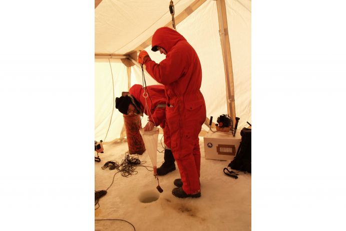 Um die Verteilung von Plankton in der Wassersäule unter dem Eis zu erfassen, müssen die Biologen Netzfänge durchführen – bei Wassertermperaturen von -1,8°C kein Vergnügen. Im Rahmen der deutsch-russischen Kooperation in der Meeres- und Polarforschung fördert das Bundesministerium für Bildung und Forschung Forschungsprojekte, die sich mit den Auswirkungen des Klimawandels in der Arktis befassen. Dr. Heidemarie Kassens forscht seit vielen Jahren in der Arktis und wurde für Ihre herausragende wissenschaftliche Arbeit mit dem Bundesverdienstkreuz geehrt. Hamburg /St. Petersburg 2017