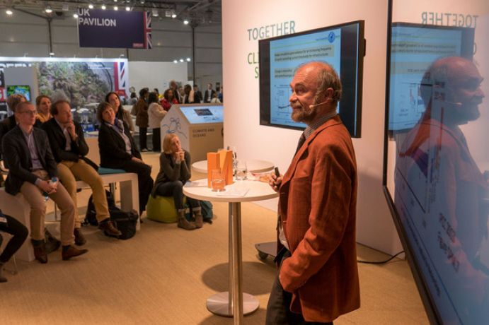Nicole Wilke (BMUB), Ottmar Edenhofer (PIK) und H.E. Janine Felson (Permanent Mission of Belize to the United Nations auf dem BMBF-Side Event "Global Stocktake: Information from science" auf dem deutschen Pavillon (COP 23, Bonn)