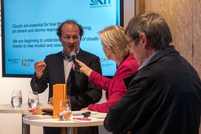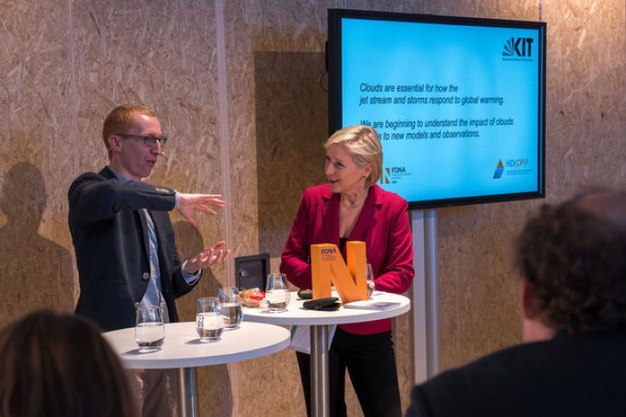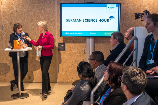 Friedemann Call (DLR PT) und Marie Luise Beck (DKK) bei der German Science Hour zum Thema „Communicating climate science" auf dem Deutschen Pavillon (COP 23, Bonn)