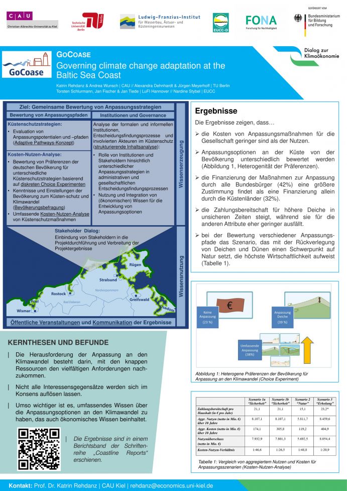 In GoCoase werden Anpassungsstrategien in enger Zusammenarbeit mit Entscheidungsträgern erarbeitet und bewertet. Dabei werden verschiedene Küstenschutzmaßnahmen evaluiert. Studienergebnisse zeigen, dass Konzepte eines „weichen" Küstenschutzes (Strandvorspülungen, Deichrückverlegungen) ein Potenzial des Mitwachsens bieten. Jedoch müssen damit eventuell verbundene Änderungen in der Flächennutzung frühzeitig in den Entscheidungsprozess einbezogen werden, um Konflikte zu vermeiden. Das Projekt liefert Informationen darüber wie Einzelpersonen und Entscheidungsträger Kosten und Nutzen von Anpassungsmöglichkeiten abwägen und wie sie dabei die Verteilungswirkungen der Maßnahmen auf unterschiedliche gesellschaftliche Gruppen berücksichtigten. Es werden geeignete Governance-Strukturen und institutionelle Hemmnisse für die Anpassung analysiert.