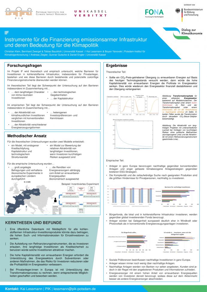 Investitionen durch den privaten Sektor werden einen zentralen Beitrag zur der Transformation zum klimaneutralen Wirtschaften leisten müssen, z. B. bei der Finanzierung von Infrastruktur für emissionsarme Energie oder energieeffiziente Gebäude und dem Handhaben der damit verbundenen Risiken. Erfolg und Tragweite hängen dabei auch von der Verfügbarkeit und Attraktivität der entsprechenden Finanzprodukte ab. Das IF Projekt untersucht bestehende und neu entwickelte Finanzierungsprodukte, insbesondere deren Attraktivität und Passgenauigkeit für verschiedene Investorengruppen, sowie das Potential zur Vermeidung von Emissionen.
