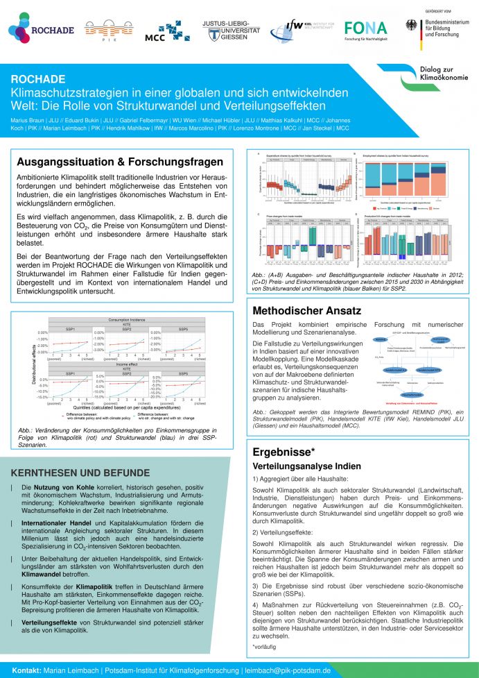 Ambitionierte Klimapolitik wird möglicherweise traditionelle Industrien negativ beeinflussen sowie das Entstehen von Industrien, die ein langfristiges ökonomisches Wachstum in Entwicklungsländern ermöglichen, behindern. Auch wird angenommen, dass Klimapolitik, z. B. durch die Besteuerung von CO2, die Preise von Konsumgütern und Dienstleistungen erhöht und insbesondere ärmere Haushalte stärker belastet. Die Rolle von Strukturwandel im Kontext von Klimawandel einschließlich der damit verbundenen Verteilungseffekte soll im Projekt ROCHADE erforscht werden.