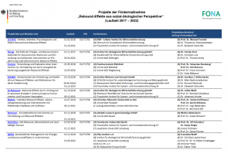Neun inter- und transdisziplinäre Verbundprojekte mit insgesamt 30 Organisationen aus Wissenschaft und Praxis erforschten die Ursachen und Auswirkungen von Rebound-Effekten und erarbeiteten Lösungsvorschläge zum Umgang mit ihnen. Das BMBF förderte diese Projekte seit 2017 mit etwa 9 Millionen Euro. Untersucht wurden die Effekte in privaten Haushalten beim Wohnen und Konsum, bei der Produktion in Unternehmen sowie auf volkswirtschaftlicher Ebene. Neben dem Fokus auf das menschliche Verhalten, war eine Besonderheit der Fördermaßnahme, dass sie nicht, wie in der Rebound-Forschung oft üblich, allein auf Energieeffizienz fokussierte, sondern auch andere Ressourcen wie Wasser und Rohstoffe betrachtete. Die Projekte decken damit eine breite Palette der Rebound-Forschung ab.