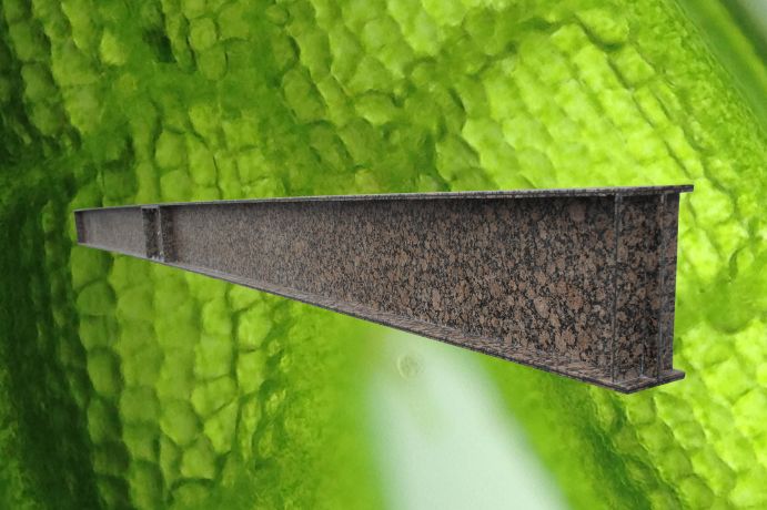 Das Fertigteil-Hauswandelement aus CFS®-Material besteht aus pflanzlichen Carbon-Fasern, Hartgestein und einer Isolationsschicht. Die Carbon-Fasern können beispielsweise aus Algen hergestellt werden und verfügen über die gleichen mechanischen Kennwerte wie bisher genutzte Polyacrylnitril-(PAN)-Fasern, die aus fossilen Rohstoffen hergestellt werden. Das Hartgestein bietet zusätzliches CO2-Absorptionspotenzial: Bei der Herstellung der Steinplatten wird die Verwitterung des Gesteins beschleunigt, sodass durch chemische Reaktionen CO2 aus der Umgebungsluft im Gestein gebunden wird. Für die Isolationsschicht zwischen den Steinplatten wird Biokohle verwendet.