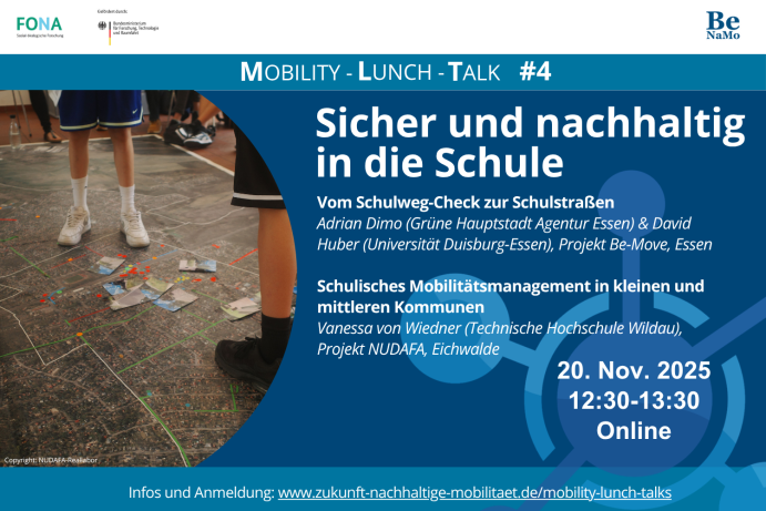 Die Mobility-Lunch-Talks sind ein einstündiges Online-Format für alle, die sich für wissenschaftliche Erkenntnisse zur praktischen Umsetzung von Mobilitätswendemaßnahmen interessieren. Für die vierte Ausgabe stehen dieses Mal zwei Beiträge zum Thema "Schulmobilität und sichere Schulwege" im Fokus.