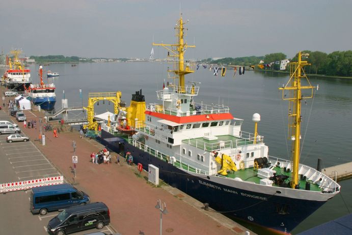 „Open Ship: Als besondere Attraktion liegen die drei Forschungsschiffe CLUPEA, DENEB und ELISABETH MANN BORGESE im Hafen und können den ganzen Tag besichtigt werden. Forscherinnen und Forscher geben Auskunft über das wissenschaftliche Arbeiten auf See und über verschiedene wichtige Themen rings um die Arbeit zum Zustand der Ostsee.