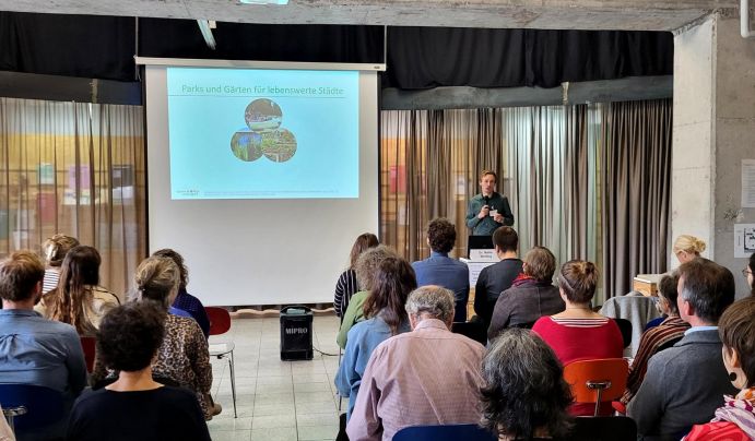 Auf der Fachtagung am 11. Oktober 2024 wurde der Wert von Parks, Kleingartenanlagen und Gemeinschaftsgärten für eine nachhaltige Stadtentwicklung diskutiert. Die Veranstaltung fand im Rahmen des Projektes Gartenleistungen statt, welches über zwei Phasen für insgesamt fünf Jahre vom Bundesforschungsministerium im Programm Ressourceneffiziente Stadtquartiere für die Zukunft (RES:Z) gefördert wurde.