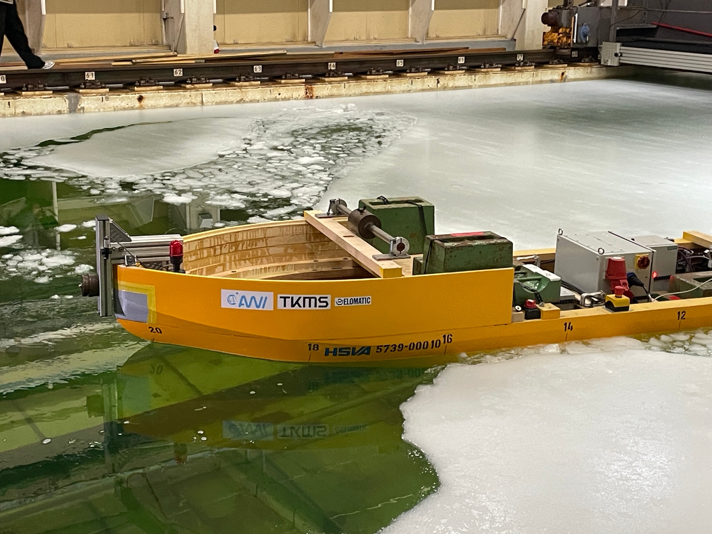 Anfang März wurde es in der Hamburger Schiffsbau-Versuchsanstalt (HSVA) noch einmal spannend: Das 5,66 Meter lange, maßstabsgetreue Modell des zukünftigen Forschungseisbrechers durchfuhr künstlich erzeugtes Eis, das mit etwa sieben Zentimetern einer realen Eisdicke von 1,8 Metern mit einer Schneeauflage von 20 Prozent entspricht. Auch dickeres Eis, wie zum Beispiel simulierte Presseisrücken brach das Modell ohne Probleme. Die finalen Eistests wurden somit erfolgreich abgeschlossen.