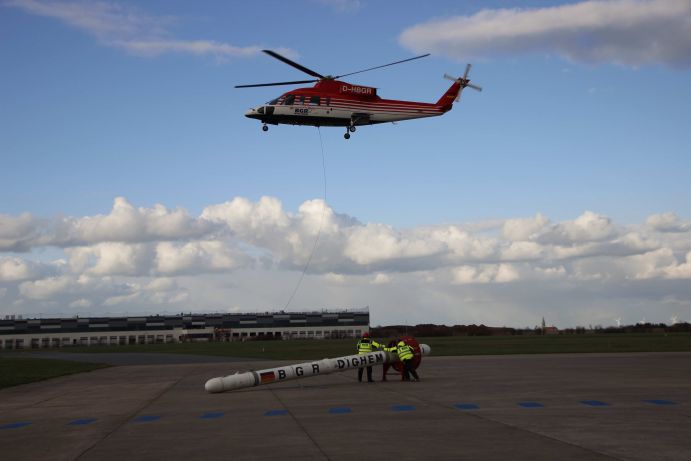 Zum Auffinden der unterirdischen Schätze steigt das Forscherteam des Projektes „DESMEX“ zunächst in die Luft. Per Helikopter werden potenzielle Lagerstätten überflogen. Ein Magnetfeldsensor am Hubschrauber erkundet – im Zusammenspiel mit auf der Erde installierten Sensoren – ob und was sich unter Tage verbirgt. Das klingt einfach, entpuppt sich im Detail jedoch als diffizile Forschungs- und Tüftelarbeit. Der Sensor hängt an einem etwa 50 Meter langen Seil am Hubschrauber. Seine Pendelbewegungen während des Flugs müssen ausgeglichen werden, um störungsfreie Abbilder des Untergrundes zu erhalten. Auch gilt es, die Induktionsströme aus der Tiefe mit den elektrischen Eigenschaften vorhandener Mineral- und Gesteinsproben abzugleichen. Erst dann wird erkennbar, welche Schätze genau in einem Erkundungsgebiet lagern. Schließlich braucht es exakte Justierungen der Sensorik, damit 1000 Meter dicke Gesteinsschichten auch durchdrungen werden können. Ein erster erfolgreicher Testflug diente vor kurzem der Probe, ob und wieweit der konstruierte Magnetfeldsensor den Erwartungen der Wissenschaftler entspricht.