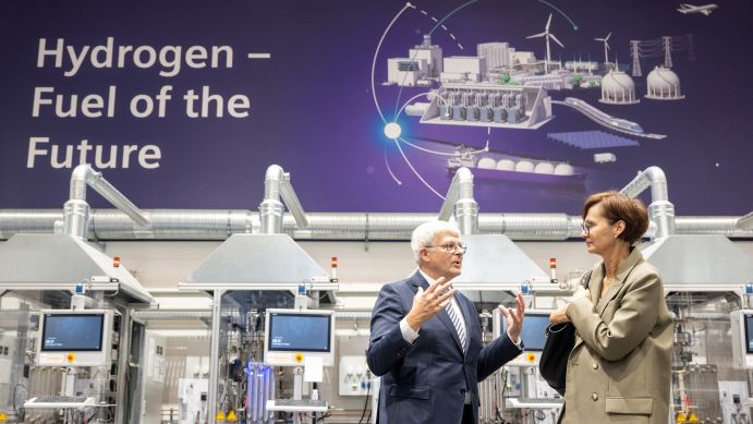 In Erlangen machte die Ministerin Halt beim Wasserstoff-Leitprojekt H2Giga. Das Leitprojekt arbeitet an der Serienfertigung von großskaligen Elektrolyseuren. Denn um Deutschlands Bedarf an Grünem Wasserstoff decken zu können, braucht es große Kapazitäten an effizienten, robusten und kostengünstigen Elektrolyseuren. Zwar sind heute bereits leistungsfähige Elektrolyseure am Markt – allerdings erfolgt ihre Herstellung noch immer größtenteils in Handarbeit. Das ist zeitaufwändig und kostenintensiv. Der Projektpartner aus Erlangen, Siemens Energy, arbeitet konkret an der Risikominimierung bei der Entwicklung und Hochskalierung eines neuen Proton-Exchange-Membrane-(PEM)-Elektrolyseurs. Dabei forscht er an neuen Fertigungsmethoden und Materialien sowie insbesondere an der Digitalisierung.