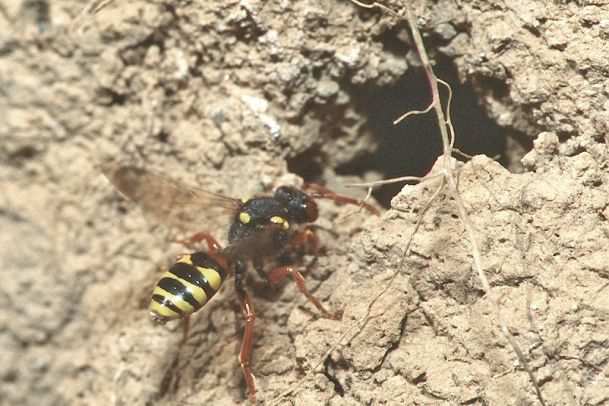 Erkennungsmerkmale: Sicherlich wird das ungeübte Auge diese Biene für eine Wespe halten. So scheinen doch die auffälligen schwarz-gelben Binden des Hinterleibs und die gelbe Punktierung in der Mitte des Körpers sehr wespenartig. Ihre Lebensweise und Details ihres Aussehens unterscheiden sich aber von Wespen. So ist die rote Färbung der Antennen und Beine typisch für Wespenbienen, nicht aber für Wespen.
