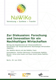 4. Wissenstransfer und Öffentlichkeitsarbeit; durch Medienarbeit, Transferworkshops und einen Begleitkreis relevanter Akteure aus Wirtschaft, Politik und Zivilgesellschaft. Durch Nutzung und Erweiterung bestehender Netzwerke in Wirtschaft, Zivilgesellschaft, Forschung und Politik wird NaWiKo die Syntheseergebnisse gezielt entscheidenden Stellen bzw. Akteuren bekannt machen. Ziel ist, dass diese Ergebnisse unternehmerische und gesellschaftliche Relevanz entfalten, Innovationsprozesse mit anstoßen und (Neu)Orientierung für Politikberatung sowie Forschungsförderung z.B. auf europäischer Ebene aufzeigen.